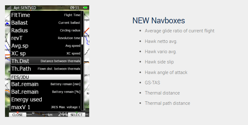 Flarmtyp- und Regionalinformationen sind nun im Flarm-Menü verfügbar. Die Wettbewerbs-ID wird nun vom Hauptgerät auf das Rücksitz- und Vario-Gerät übertragen (es müssen keine FLARMnet-Dateien auf dem Rücksitz oder Vario installiert werden). Wir haben auch eine Verkehrswarnung hinzugefügt. Flarmsymbol zeigt ein Dreieckssymbol für unbekannte Flugzeugtypen, Luftschiffsymbol für Luftschifftyp (wurde in früheren Versionen als Ballon angezeigt). (Power) FLARM-Firmware kann über Wi-Fi aktualisiert werden.