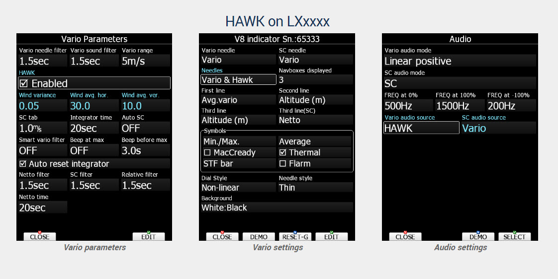 Nachdem HAWK erfolgreich installiert wurde, findet man im Setup verschiedene HAWK Einstellmöglichkeiten. Das bisherige TEK-Vario läuft parallel mit den bisher eingestellten Parametern weiter. Wir empfehlen auch beide Variometer anzeigen zu lassen!