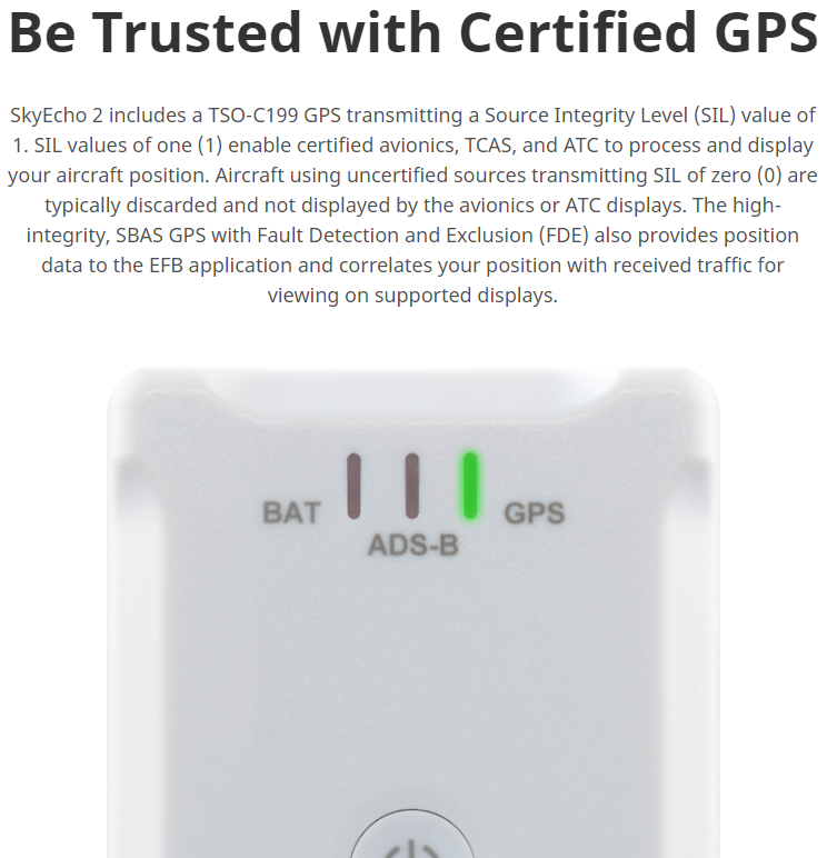 SkyEcho enthält ein TSO-C199-GPS, das einen Source Integrity Level (SIL)-Wert von 1 überträgt. SIL-Werte von eins (1) ermöglichen zertifizierten Avioniksystemen, TCAS und ATC die Verarbeitung und Anzeige Ihrer Flugzeugposition. Flugzeuge mit nicht zertifizierten Quellen, die einen SIL-Wert von Null (0) senden, werden in der Regel aussortiert und von der Avionik oder den ATC-Anzeigen nicht angezeigt. Das hochintegrierte SBAS-GPS mit FDE (Fault Detection and Exclusion) liefert auch Positionsdaten an die EFB-Anwendung und korreliert Ihre Position mit dem empfangenen Verkehr zur Anzeige auf unterstützten Displays.