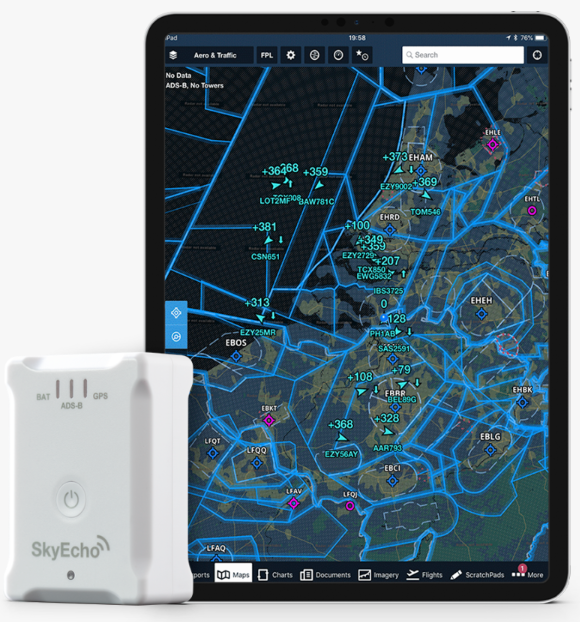 SkyEcho überträgt Flugzeugposition, Höhe, Kurs und Geschwindigkeit an umgebende Flugzeuge. Das Gerät kann FLARM und ADS-B Signale auf z.B. SkyDemon, EasyVFR, AirMate oder ForeFlight Mobile per WIFI übertragen darstellen.